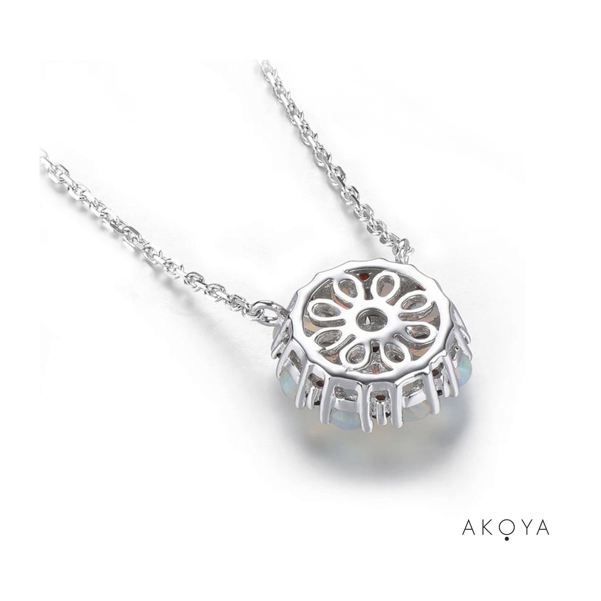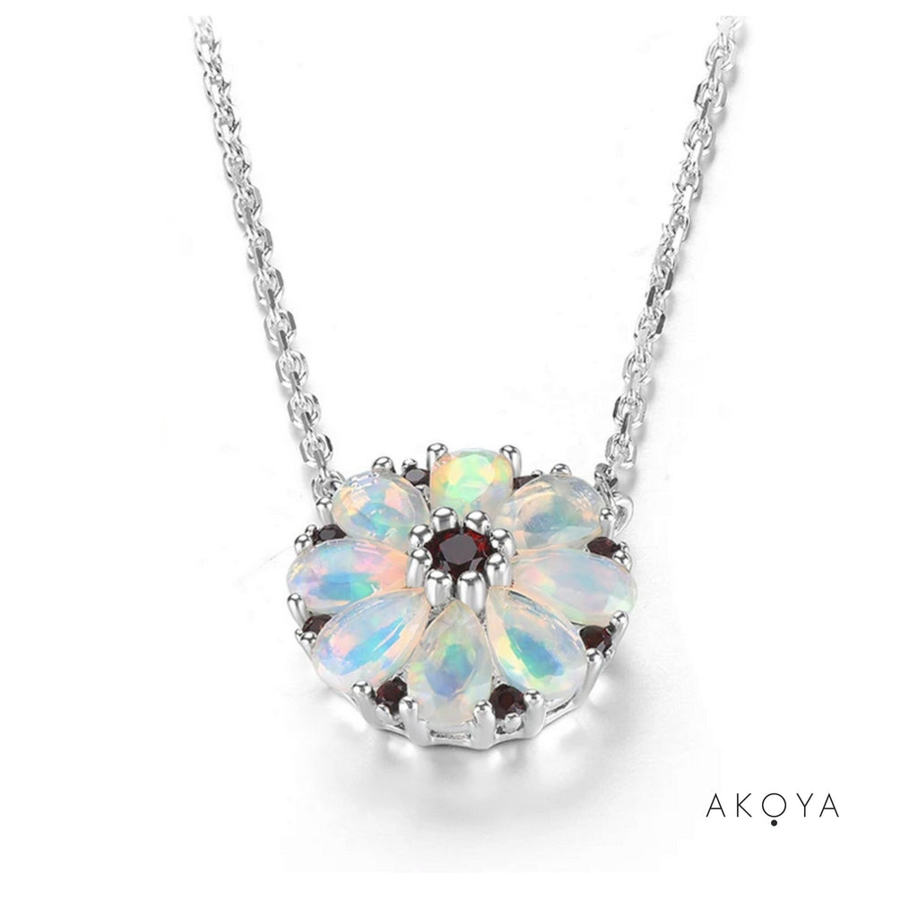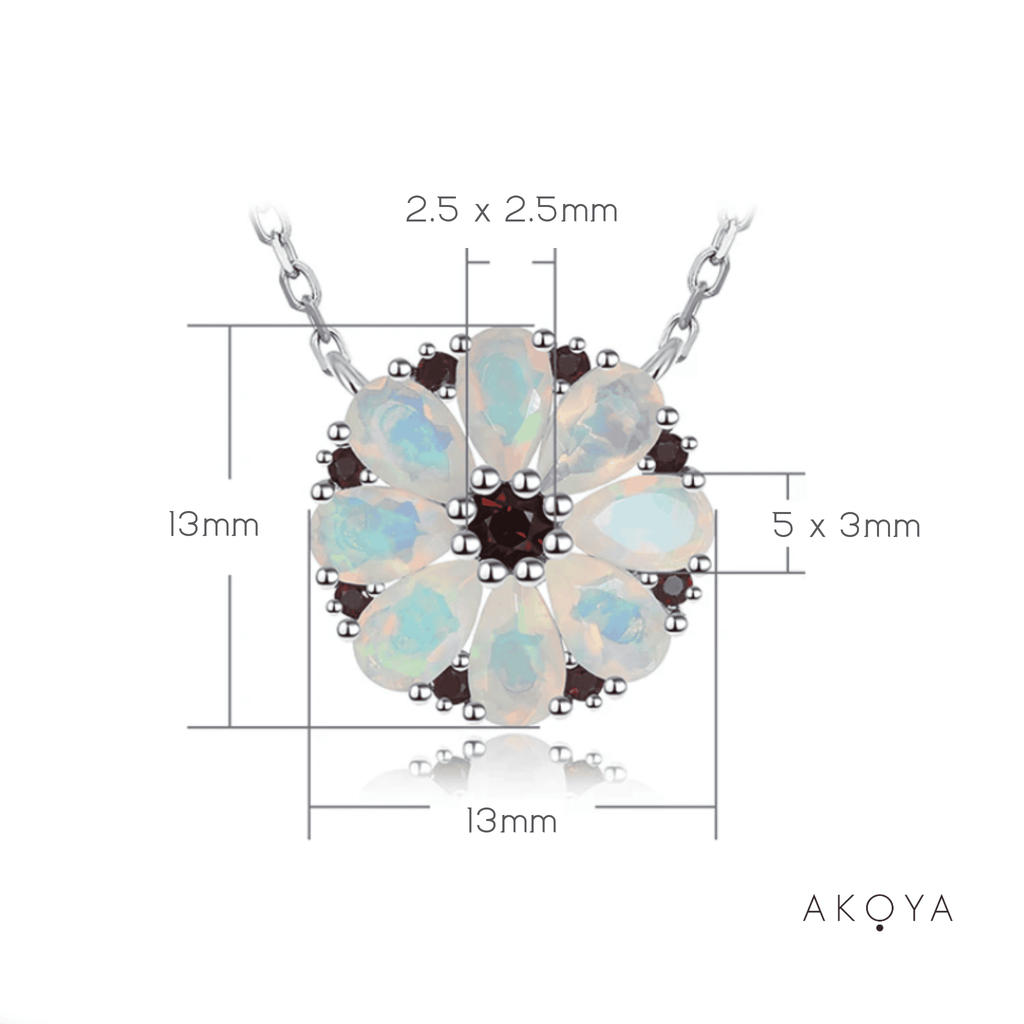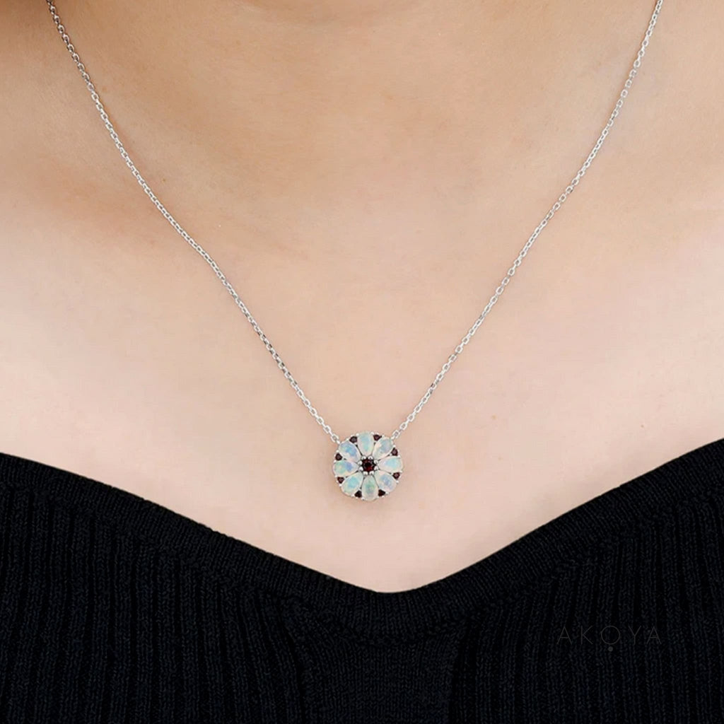 Feel beautiful with this pretty Opal and Garnet Flower necklace set in sterling silver on a sterling silver chain.